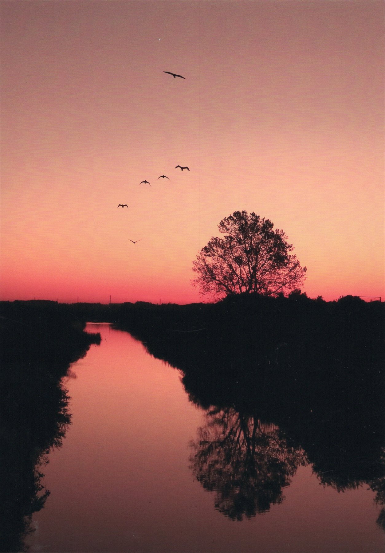 - 燃えるような夕焼け。中央の土手で空と田んぼに仕切られて「深紅」の夕焼けがツゥートーンになったが、そのハーモニーが美しい。 (評は河野和典元日本カメラ編集長)