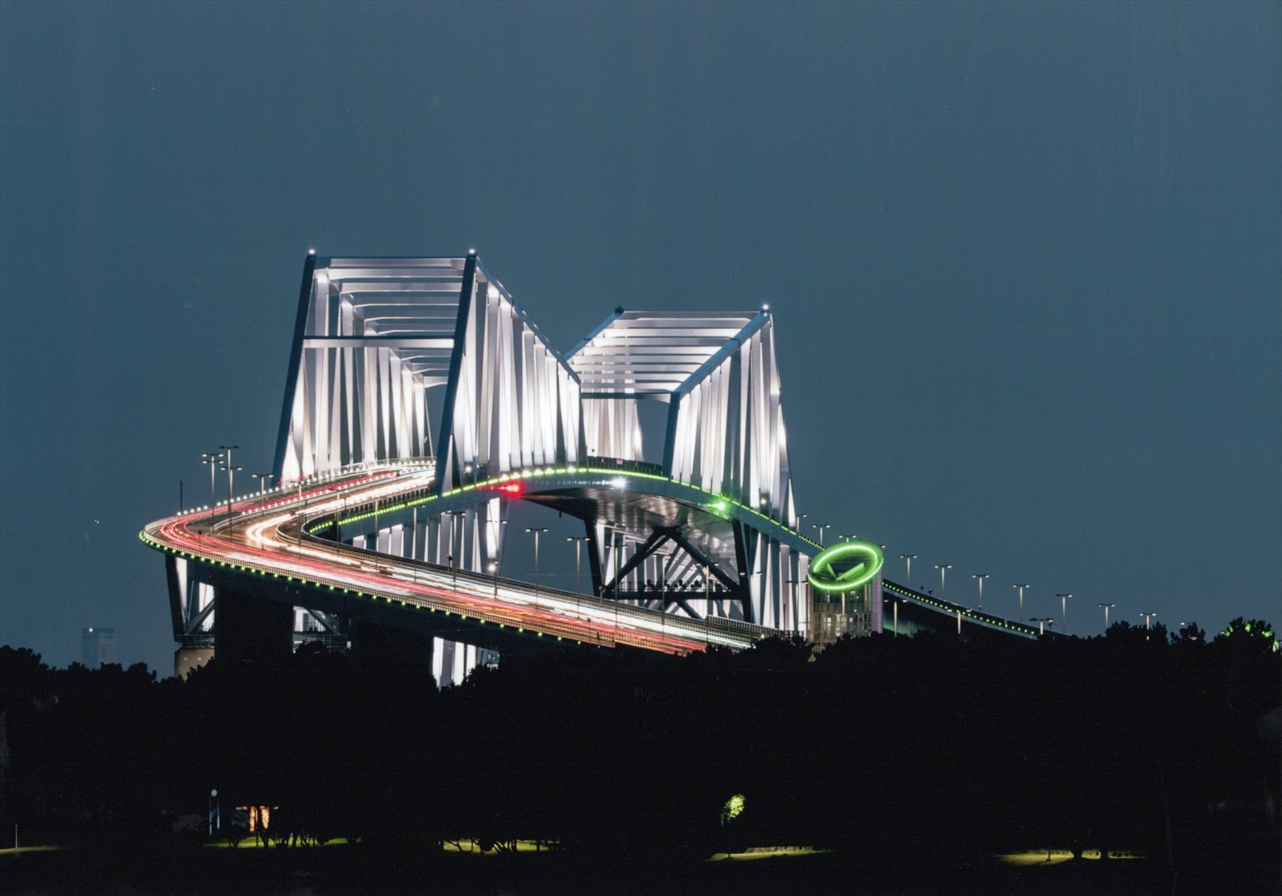 - 派手なネオンでデザインされた夕景の大観覧車。薄暮の空に大輪の花火のごとく輝く実像に対して、暗く沈んだ水面に濃い色でもう一つ追加して描いたところがミソ。タテ位置画面でピタリと決めている。 (評は河野和典元日本カメラ編集長)